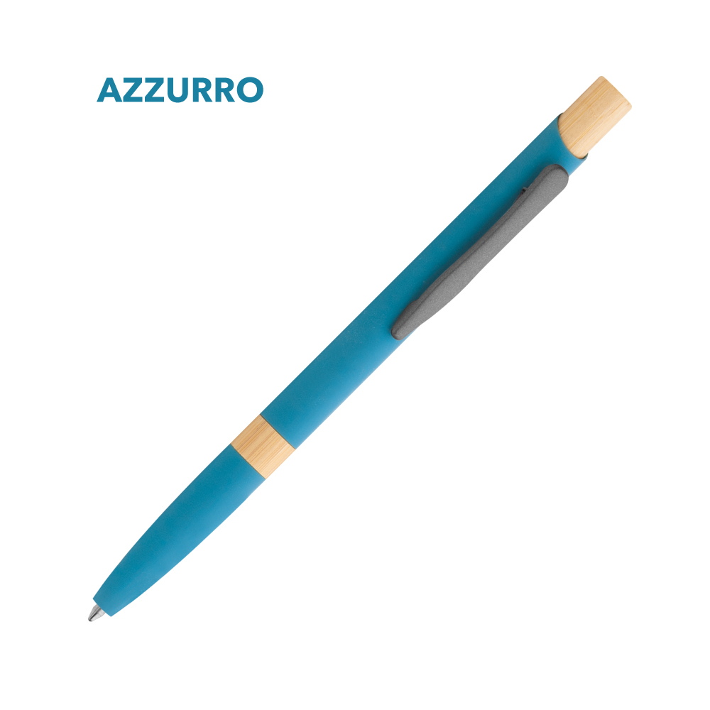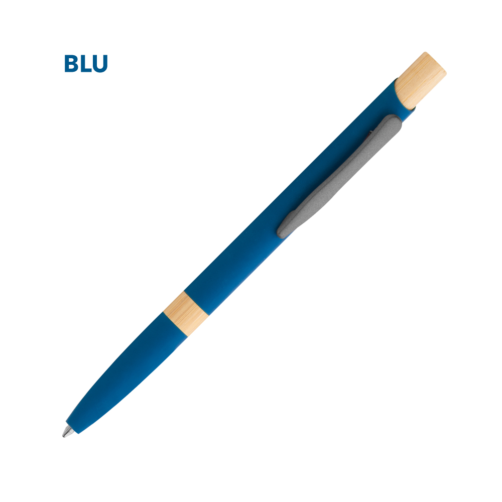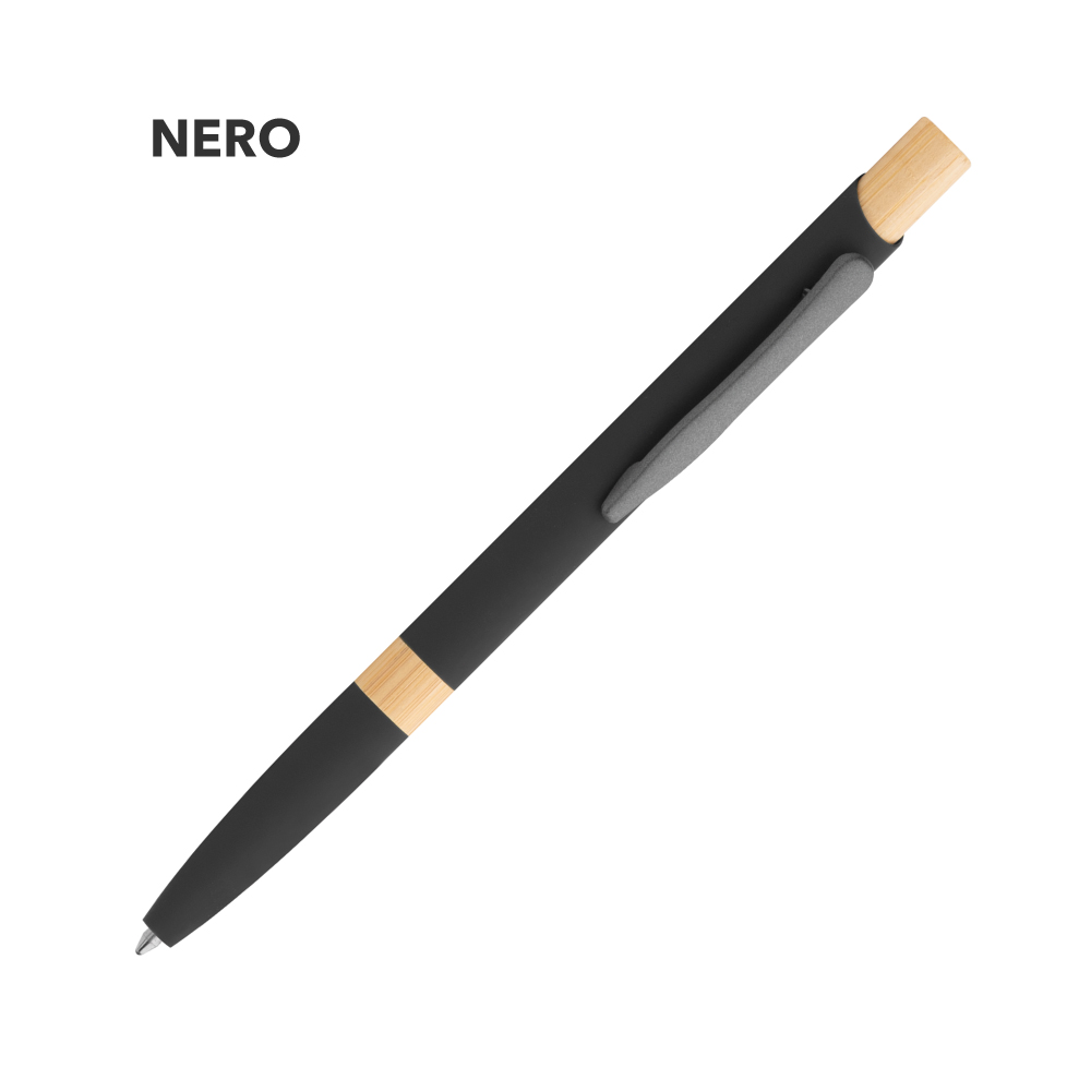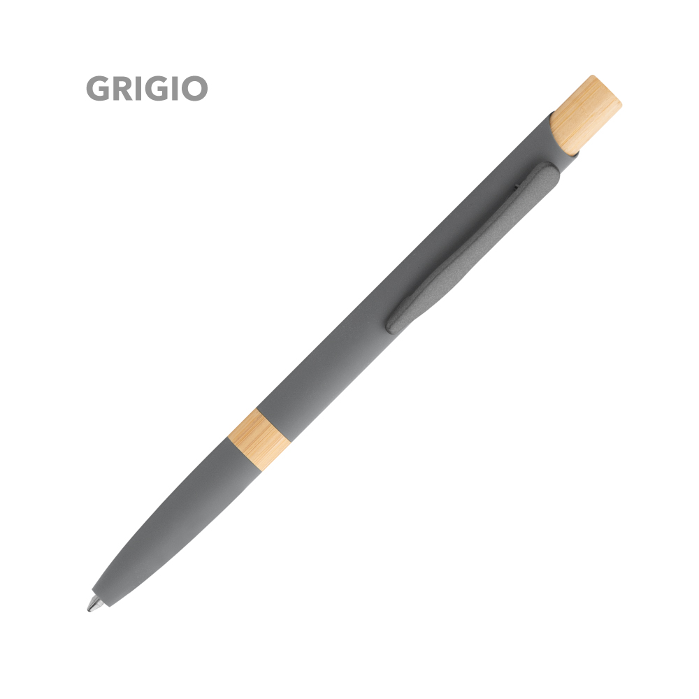 Elegante penna a sfera in metallo con fusto in lacca soft touch e dettagli in bamboo, minuterie in metallo grigio.