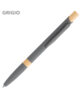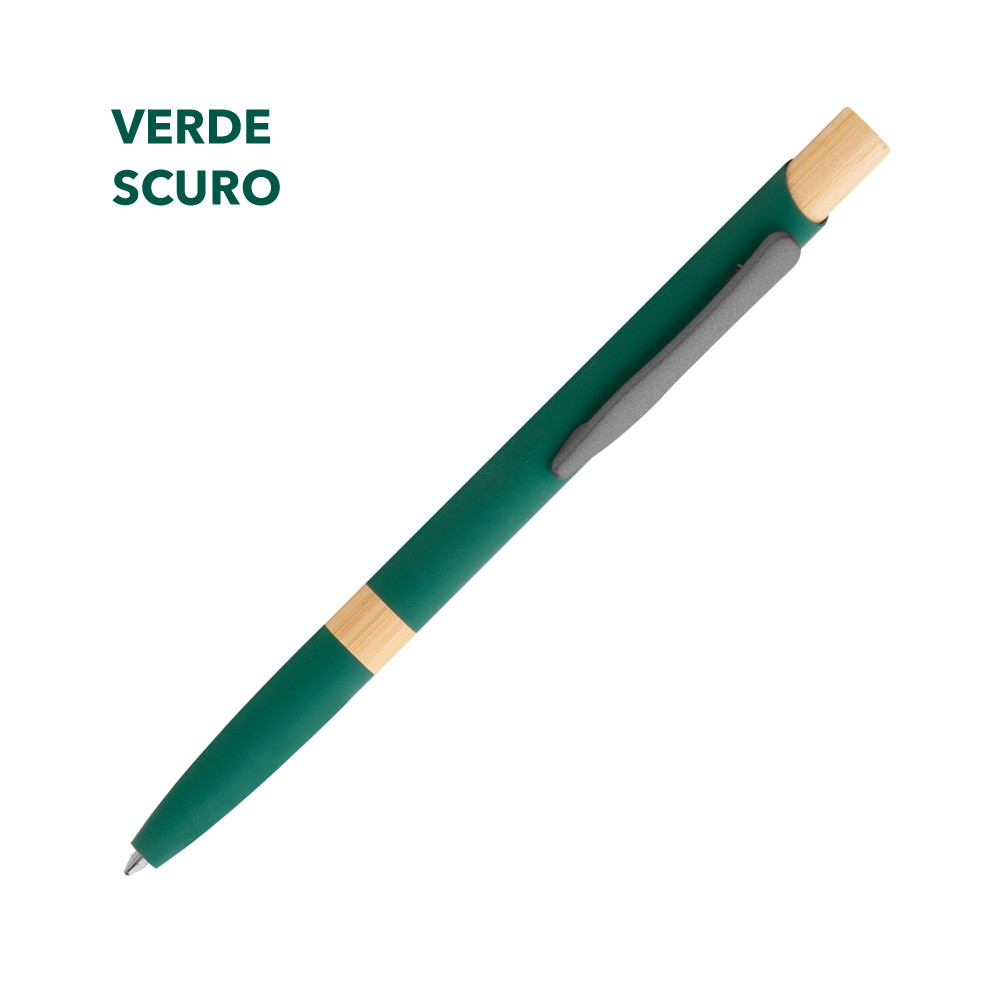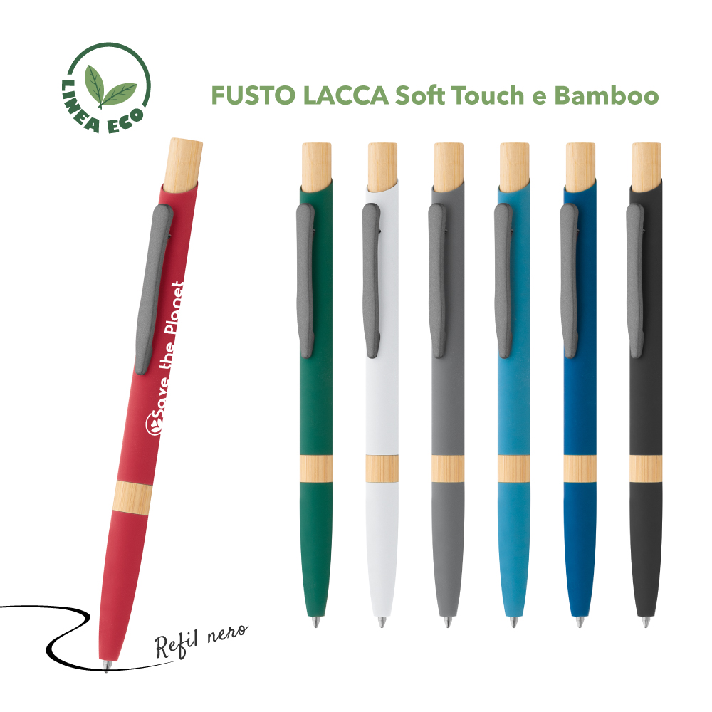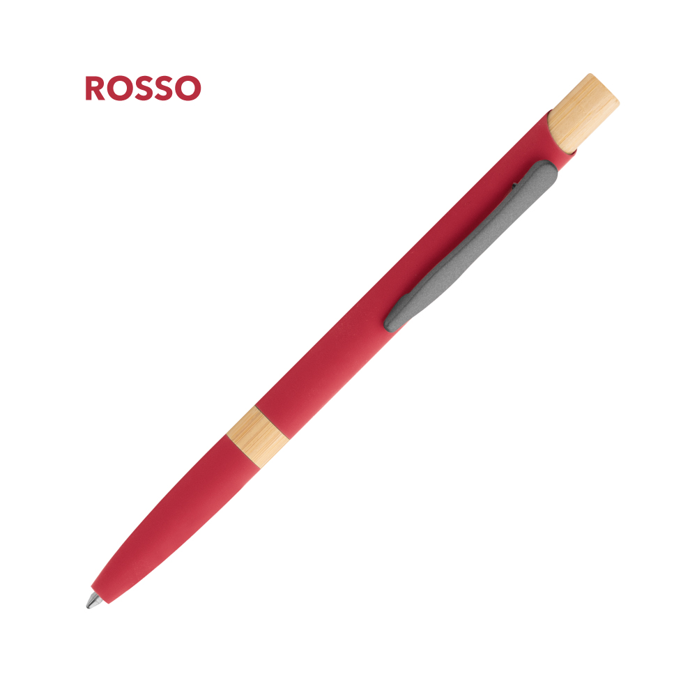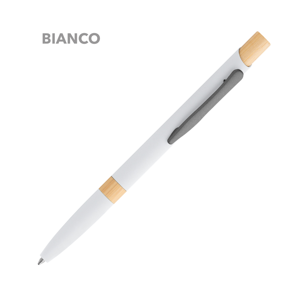 Elegante penna a sfera in metallo con fusto in lacca soft touch e dettagli in bamboo, minuterie in metallo grigio.