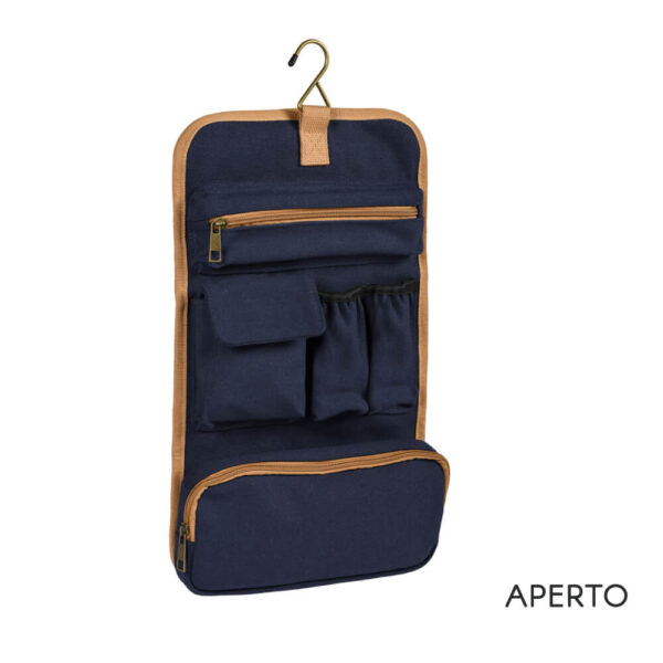 Beauty appendibile in policotone canvas con apertura a libro, tasche interne e scomparto inferiore removibile. Dimensioni: 18,5x25x5