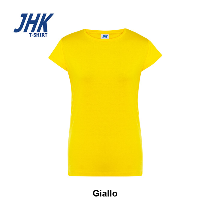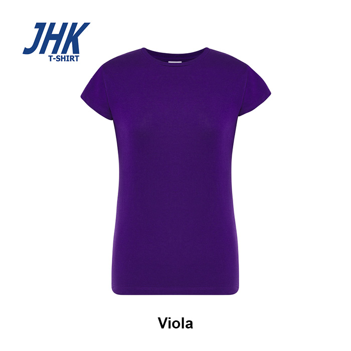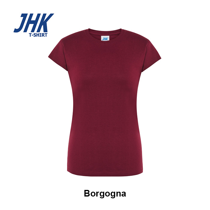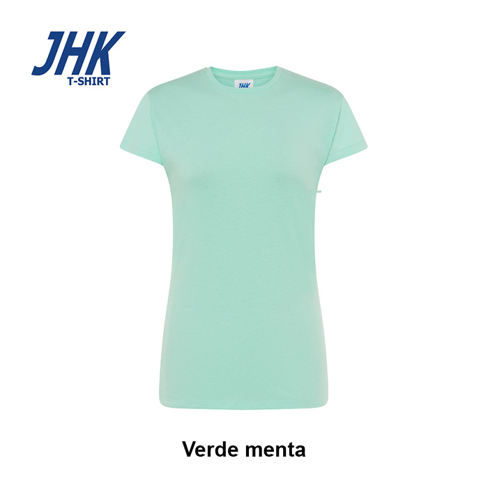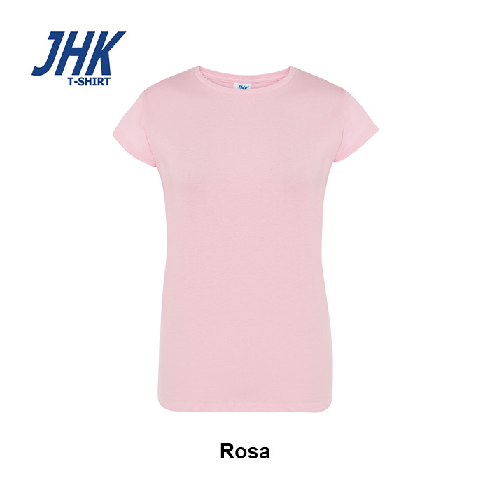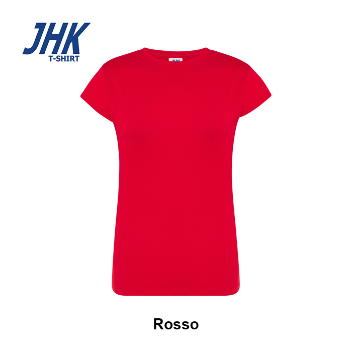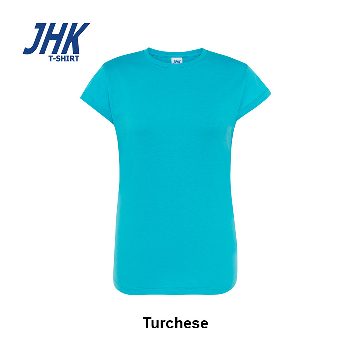 T-shirt Lady Regular JHK da donna in 100% cotone colorato 150 g/m² preristretto, leggera e confortevole. Dotata di collo in elastan, fettuccia interna da spalla a spalla e ribattitura a doppio ago per maggiore resistenza. Presenta doppia cucitura su collo, maniche e girovita ed etichetta rimovibile per un comfort ottimale.