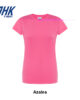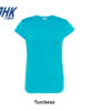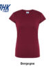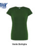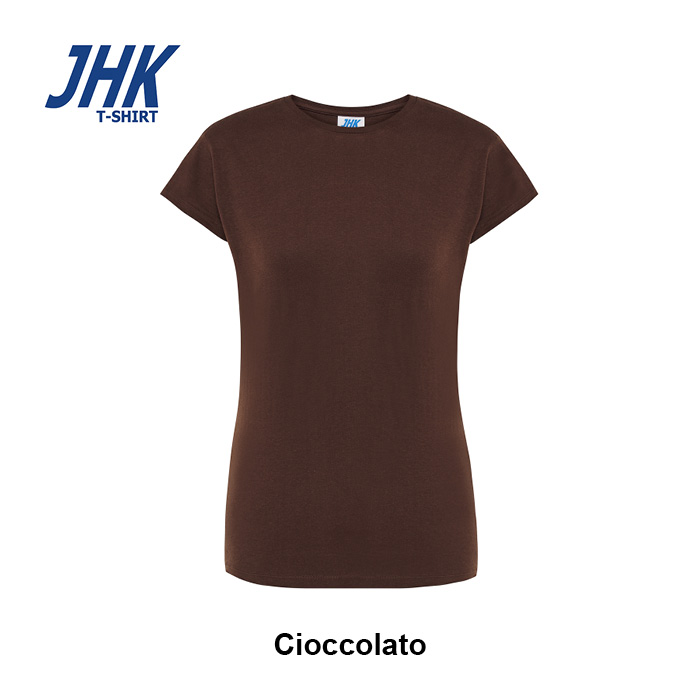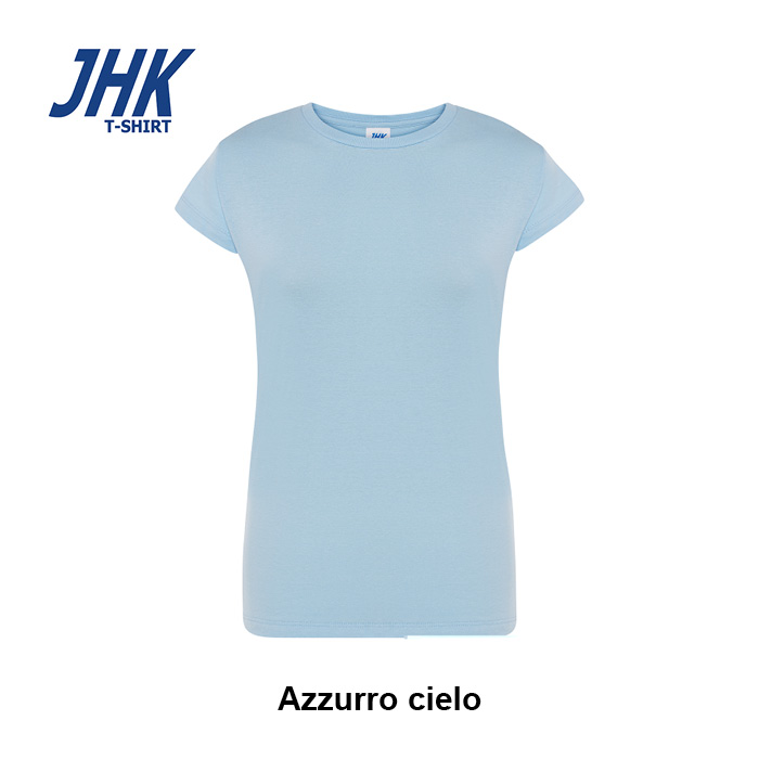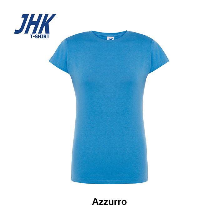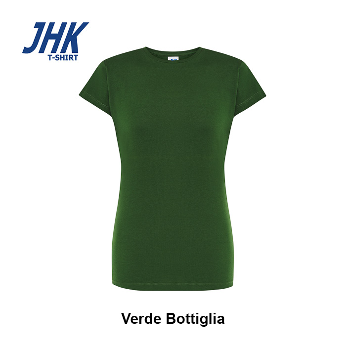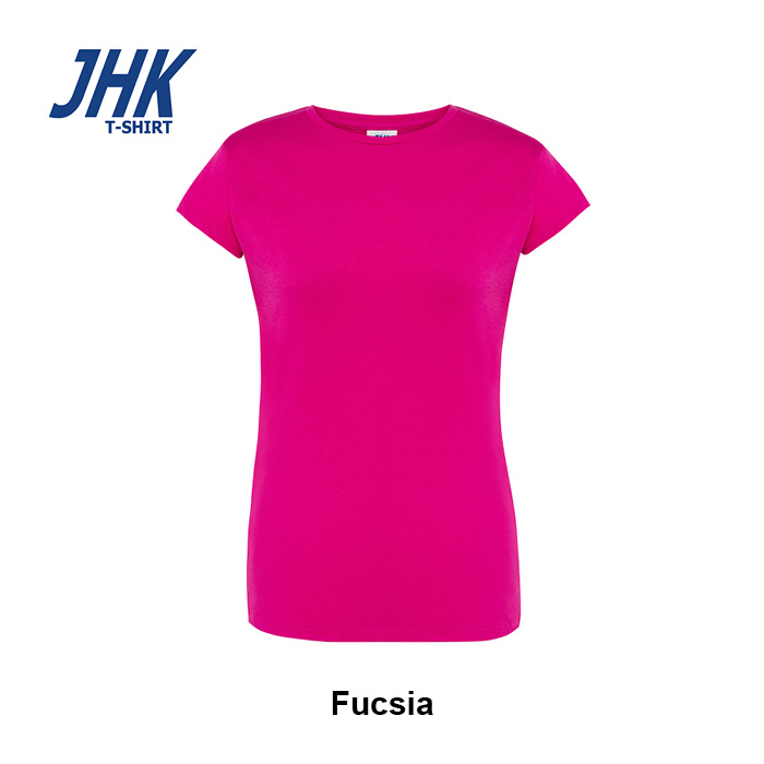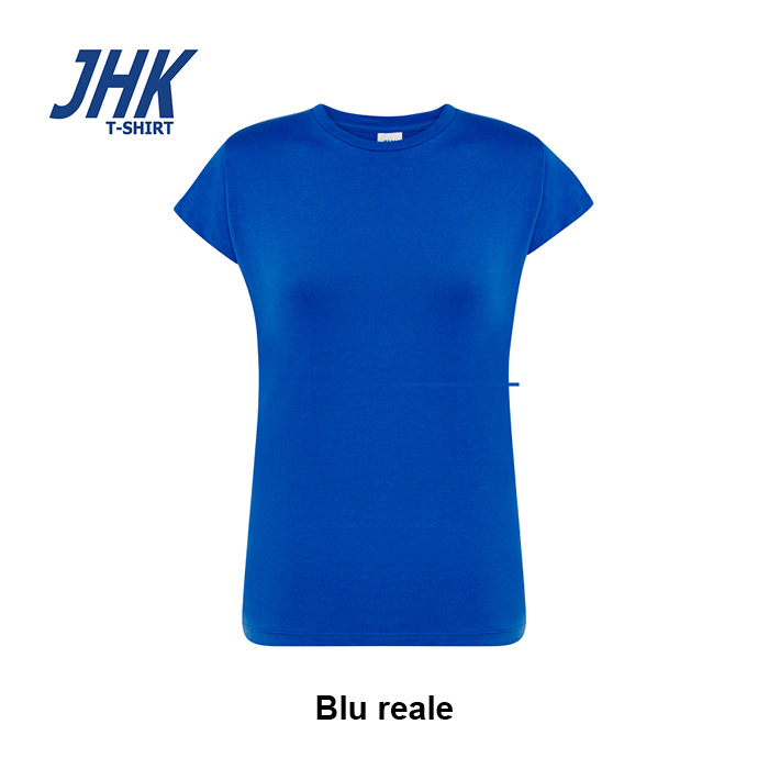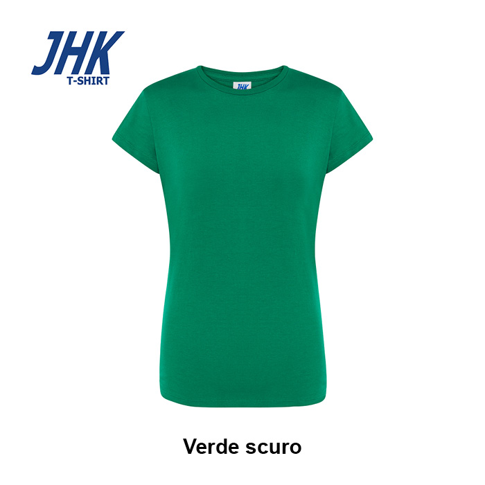 T-shirt Lady Regular JHK da donna in 100% cotone colorato 150 g/m² preristretto, leggera e confortevole. Dotata di collo in elastan, fettuccia interna da spalla a spalla e ribattitura a doppio ago per maggiore resistenza. Presenta doppia cucitura su collo, maniche e girovita ed etichetta rimovibile per un comfort ottimale.