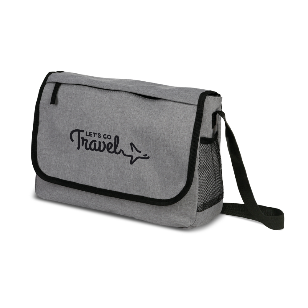 Tracolla Meeting Regolabile โ€“ Elegante e Funzionale. In grigio melange, con ampia tasca frontale, scomparto principale con zip e rete laterale portabottiglie. Perfetta per riunioni e viaggi d’affari!