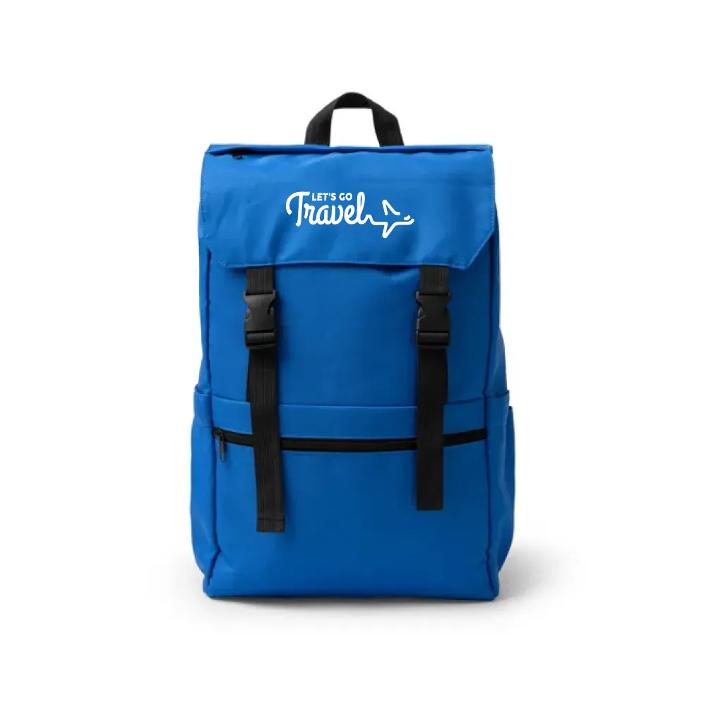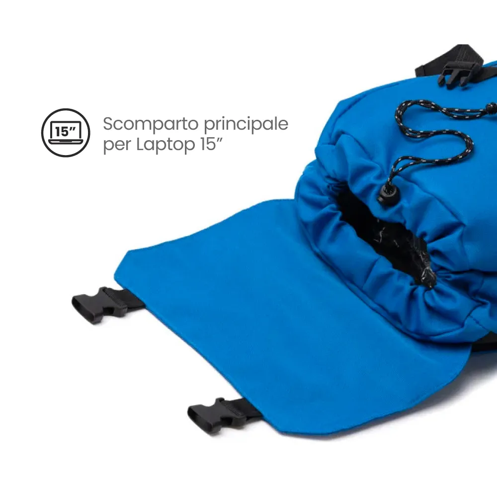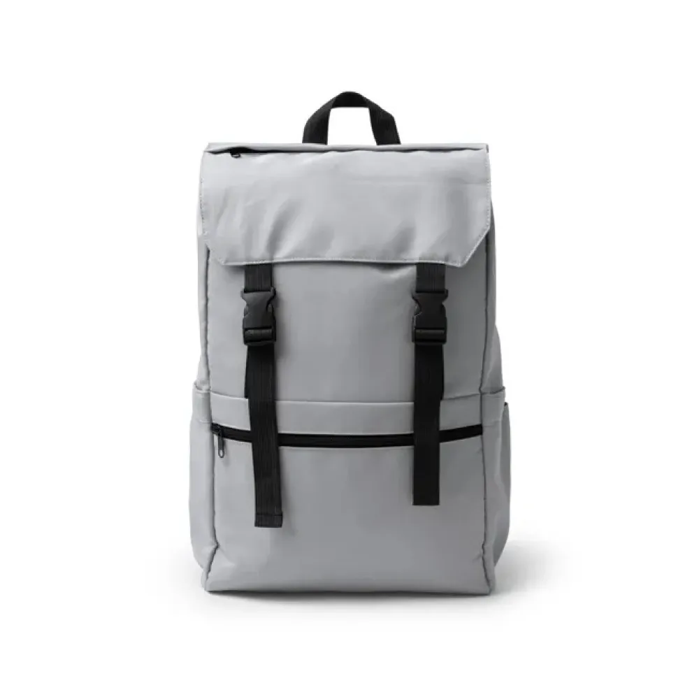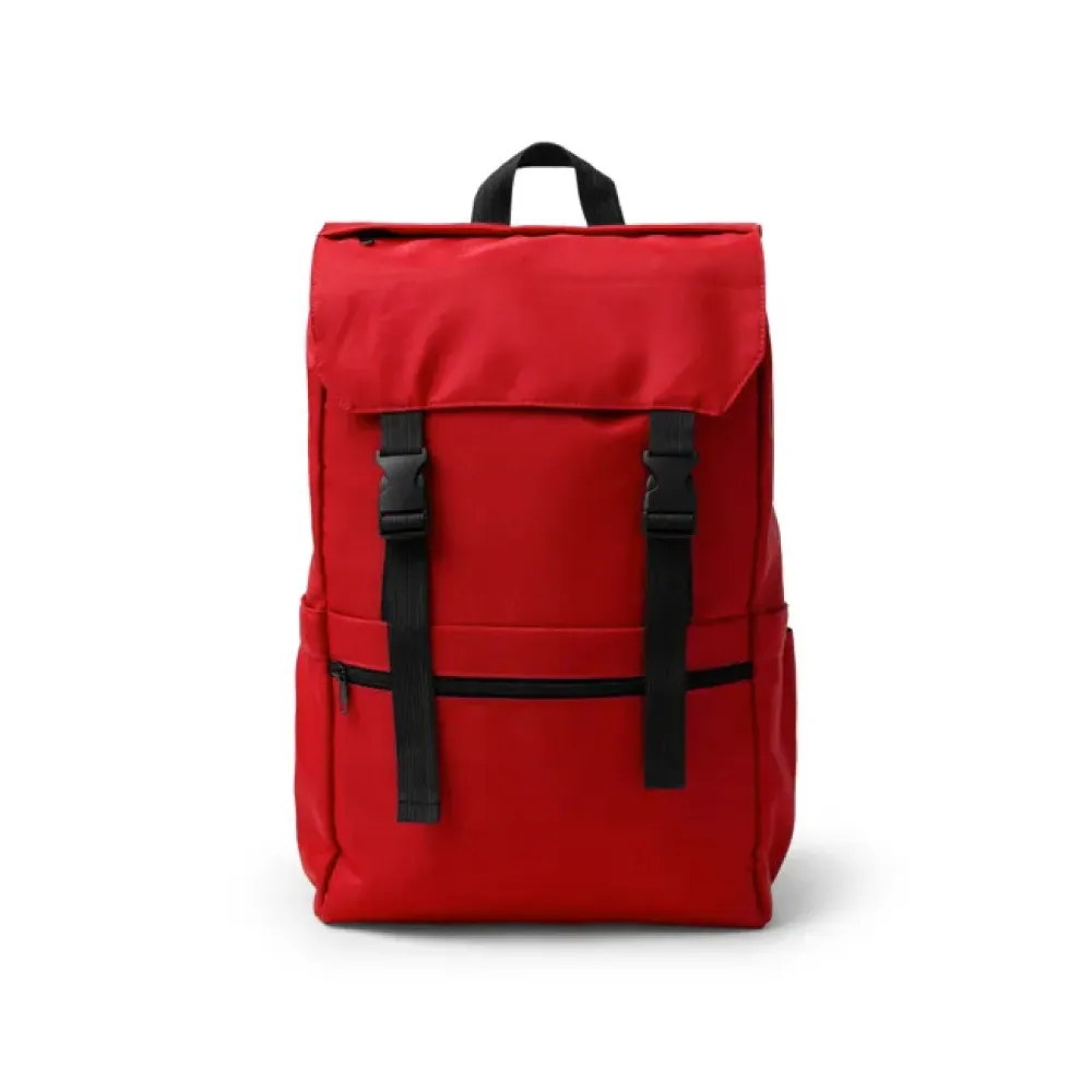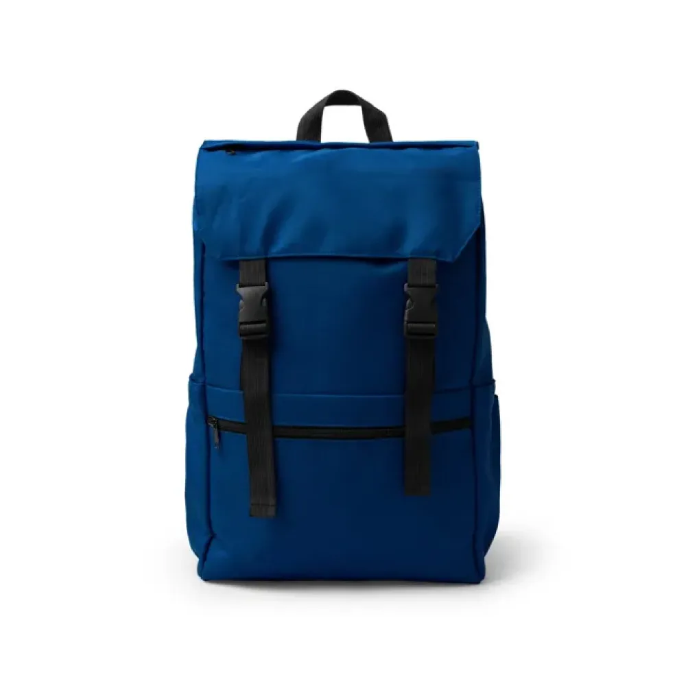 Zaino Solap con patta in RPET 600D, con chiusure regolabili e scomparto principale con tasca interna per laptop fino a 15″. Dotato di tasca sulla patta, tasca frontale con zip e tasche laterali con elastico. Schienale e manici imbottiti.
